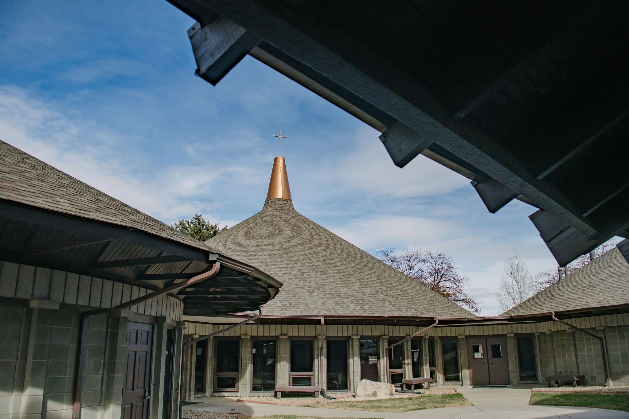 Gathering Place / Fellowship Hall / Outreach Pods: Rotating clockwise from the sanctuary pod, the other three pods of our facility include the Gathering Place, the Fellowship Hall, and the Outreach pod, which can all be accessed from multiple places on our campus. There are four sets of double doors for entry: one on the north (16th Street) side of the campus, one on the east side of the campus, and two from the courtyard enclosed by our four building structures.
